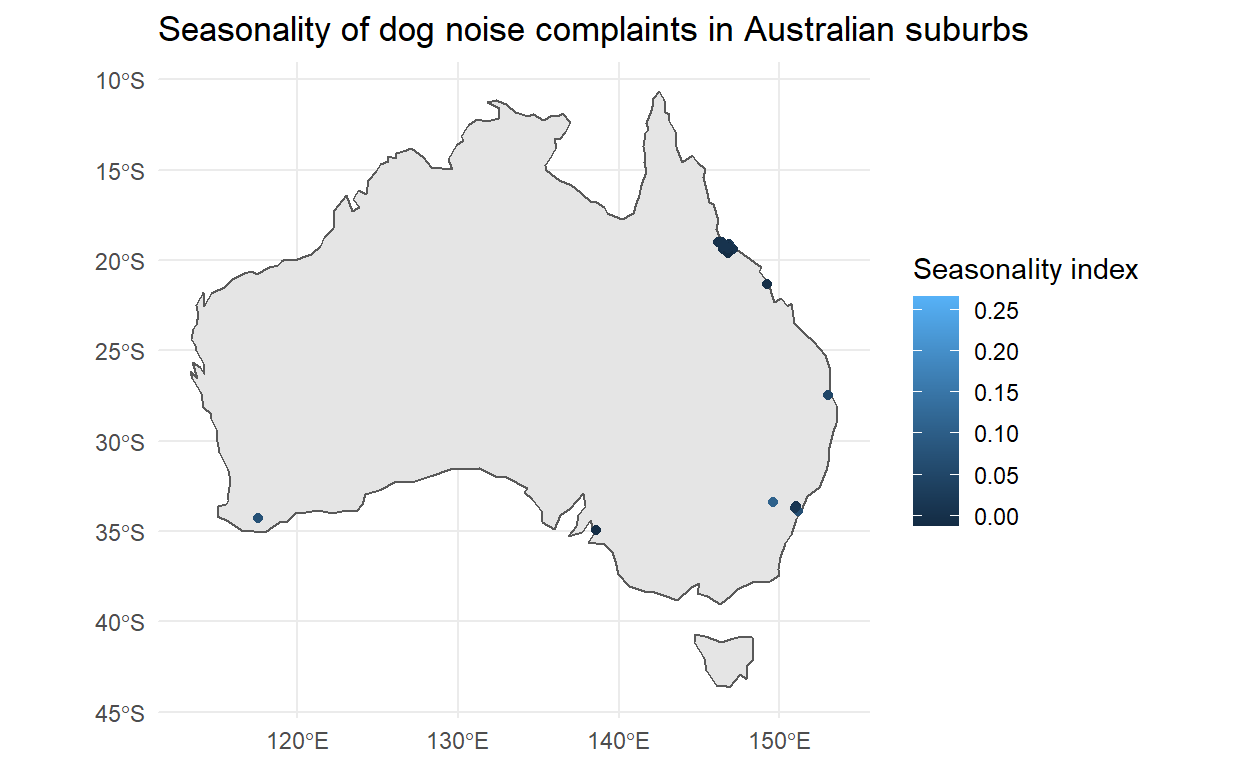 Which Australian suburbs show most seasonality in dog noise complaints?