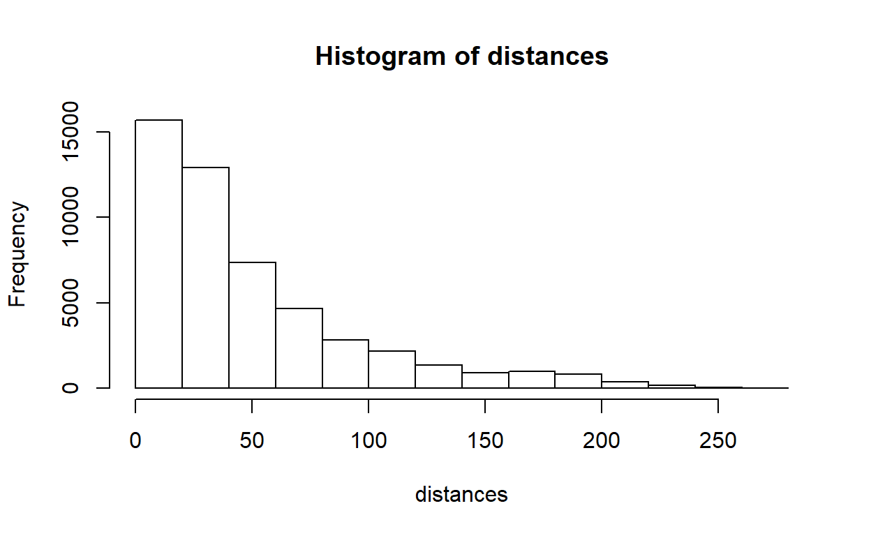 We see there are many visitors from near Amsterdam, who are unlikely to want to make use of the bus transport there. What does the distribution of distance-from-Amsterdam look like?