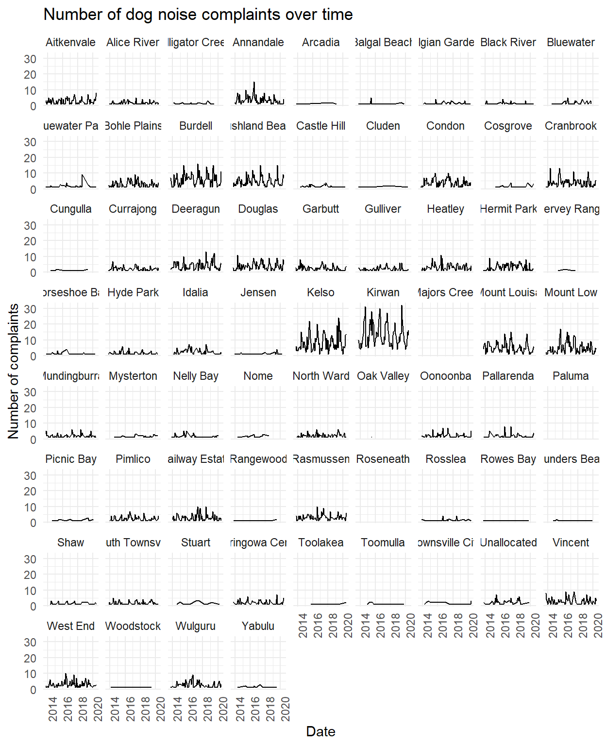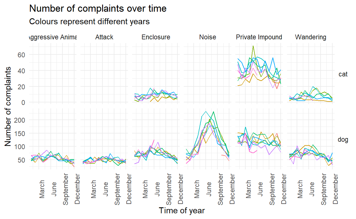It appears there is seasonal variation in some types of complaints, but not others. Particularly, noise complaints for dogs are much more common during Australian winter: perhaps dogs kept indoors more, or perhaps neighbours are bothered by noise more quickly when they stay inside.