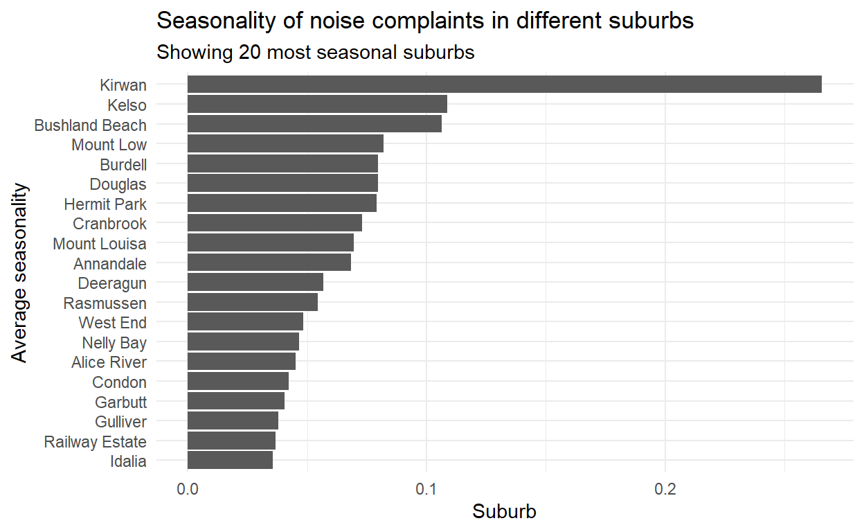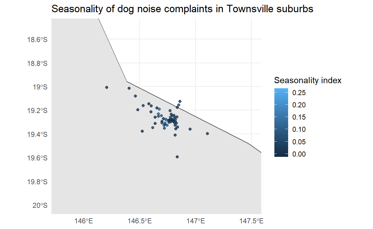 labs(title = 'Seasonality of dog noise complaints in Townsville suburbs',